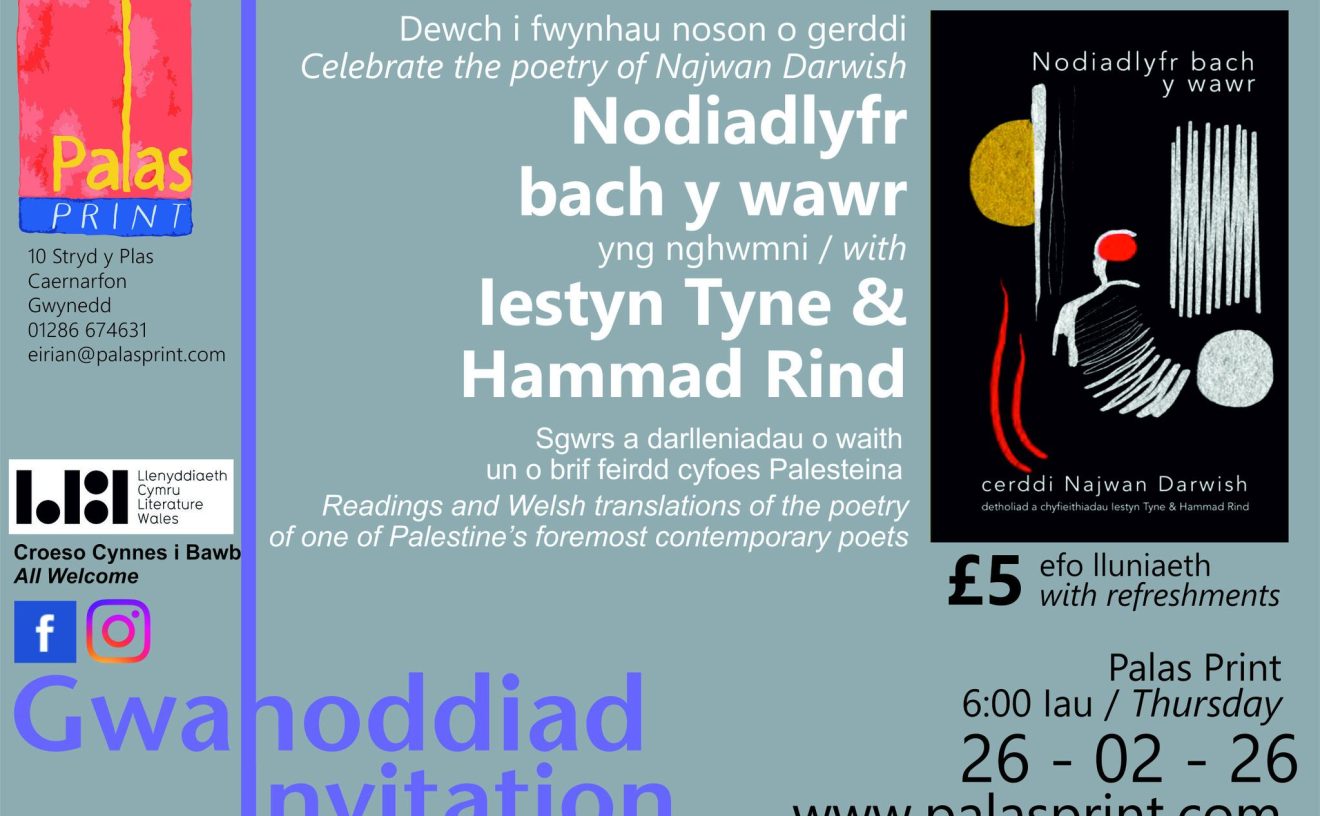 Dewch i fwynhau noson o gerddi Nodiadlyfr bach y wawr yng nghwmni Iestyn Tyne a Hammad Rind. Sgwrs a darlleniadau o waith un o brif feirdd cyfoes Palesteina, Najwan Darwish. £5 hefo lluniaeth.